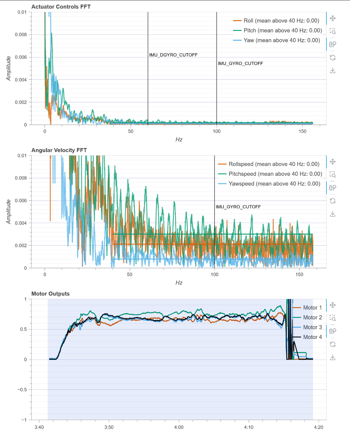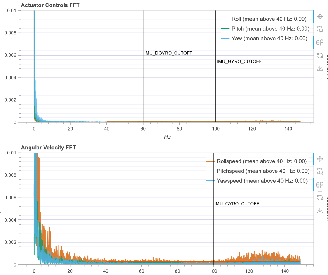 I optimized the installation of the damping balls (adjusting the verticality/parallelism of the fixing screws and replacing the damping balls with ones of different hardness), which had a significant impact on yaw. Now the inner-loop FFT looks acceptable, but after adding the outer-loop optical flow, I noticed it cannot hover properly. It still feels like there’s an issue somewhere. Could it be that the 3D-printed arms are not rigid enough?