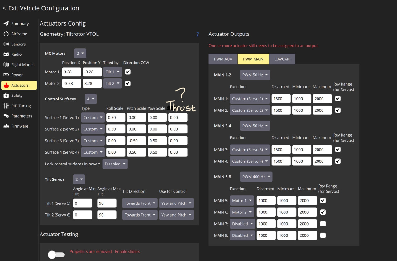 when creating a custom airframe, is there a way to add throttle/Thrust into the mixing on the actuator’s page of Q ground control for PX4? I would like for motor 2 to have Thrust and Pitch Mixed for custom vehicle for example (servo controlled thrust, no propellers)