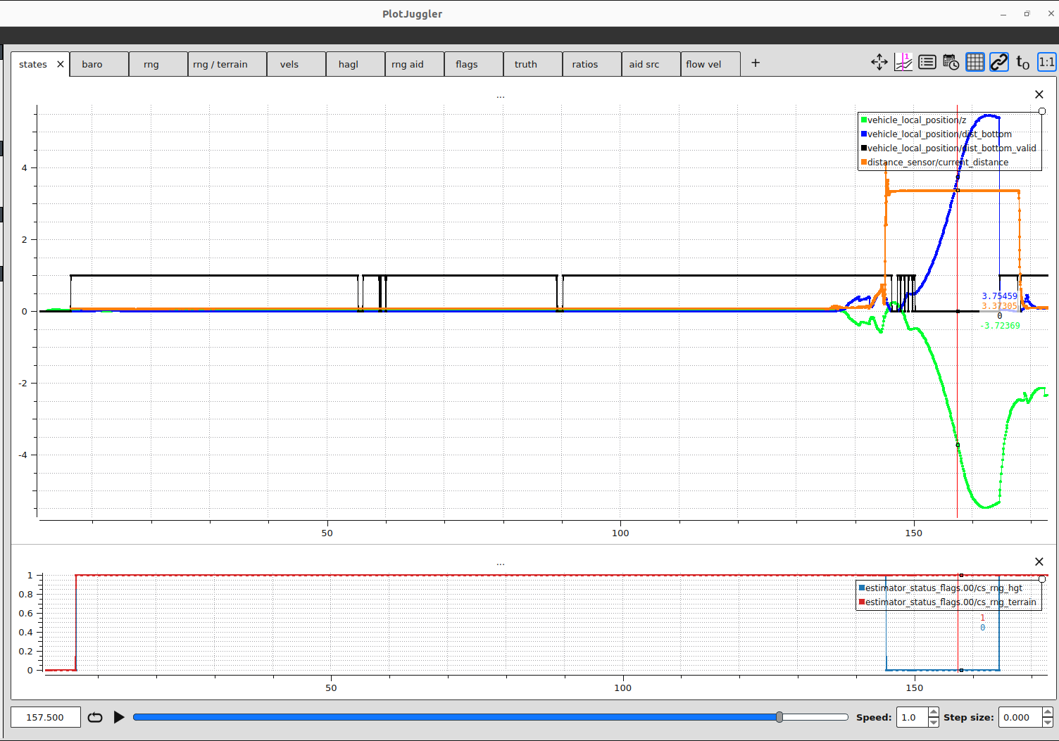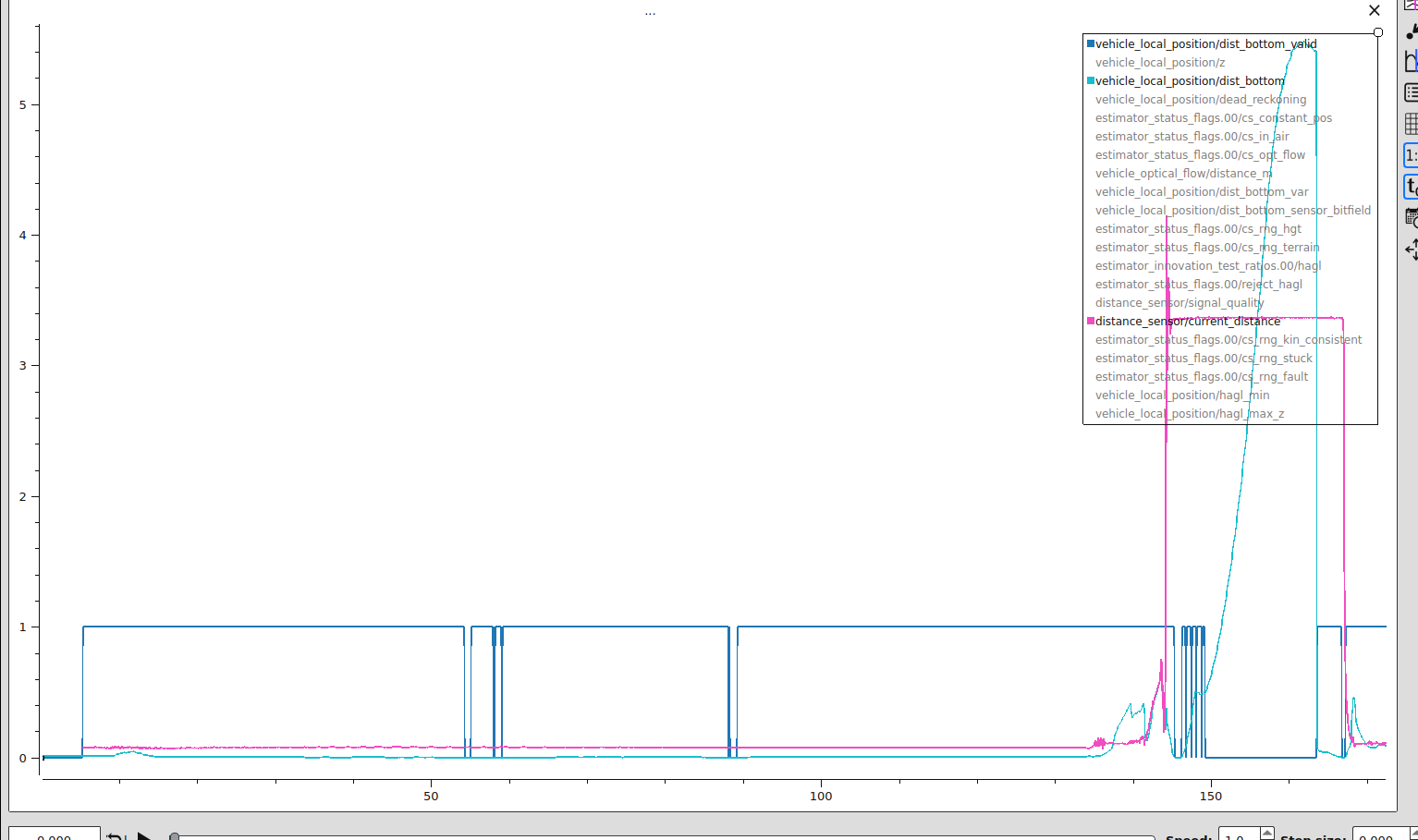 Here’s the catch: dist_bottom_sensor_bitfield is 1 which corresponds to rangefinder so supposedly the rangefinder is being used in the estimate for dist_bottom. cs_rng_terrain is 1 for the whole flight so it should be being fused for terrain estimates (which to my knowledge is what gets used for dist_bottom). The dist_bottom_valid flag is 1 for the majority of the recorded flight especially on the ground. dist_bottom_valid flag is 0 however when it starts to take off.