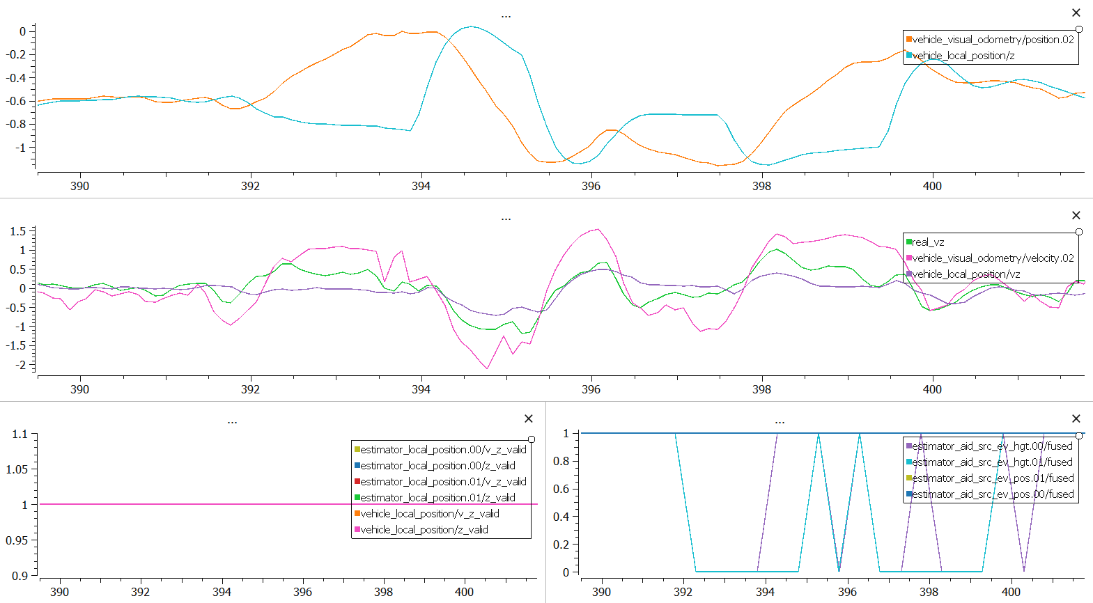 The estimated vertical speed is around 0 and the estimated altitude is stable, but the drone is going downward/upward. After some time, the estimate recovers.