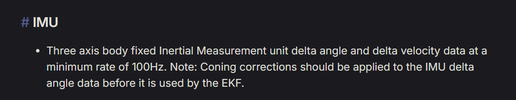 However, EKF2 refuses to initialize if I disable all the inbuilt IMUs. Error message just shows “Waiting for estimator to initialize“ and “No valid attitude estimate“. Anything else I can check? Or is my publish rate too low? 100hz seems okay according to the documentation.