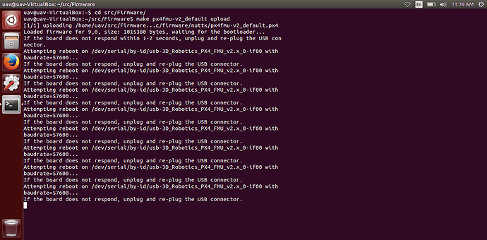 I got the following error while uploading the firmware thru ubuntu terminal. I installed ubuntu in a virtual box. I could compile the code using cmake. The compiled firmware i could upload using Mission Planner in windows. Also the pixhawk is detected in QGC which installed using virtual box. The baudrate i used in the mission planner is 115200 where as in the terminal it is using 57600.