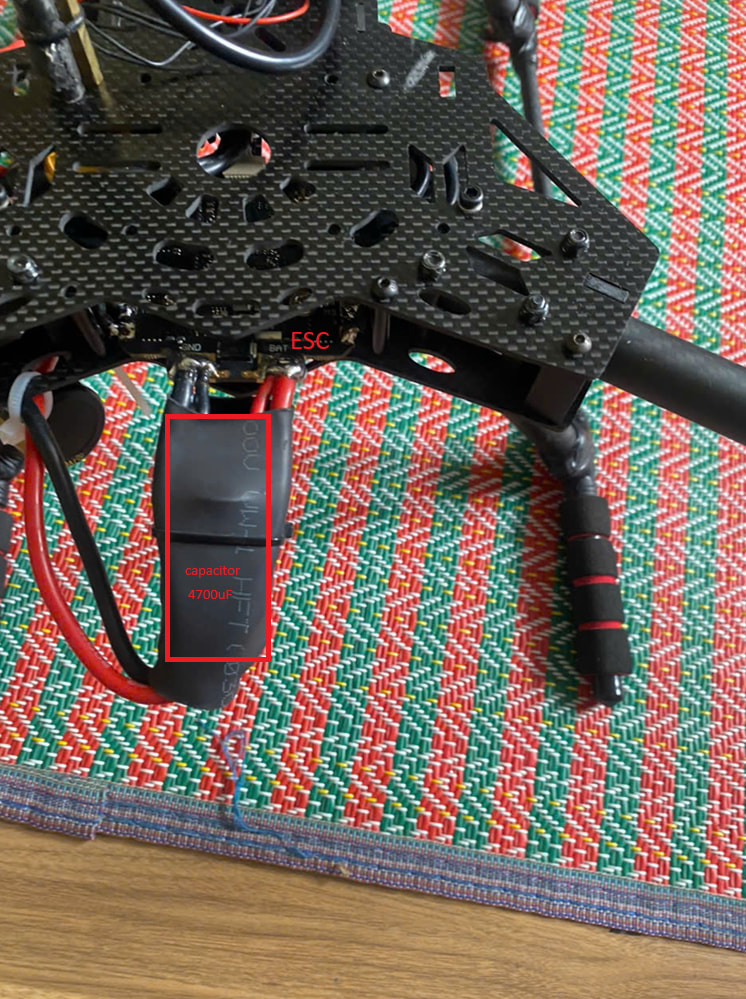 When I arm and increase the throttle, the aircraft cannot take off even though the motor directions and order are set correctly. At full throttle it lifts slightly, then suddenly loses power and falls down (I notice that the Pixhawk reboots). In many cases, even just arming causes the ESC to fail. The 4700 µF input capacitor on the ESC has swollen and had its leads break off multiple times.