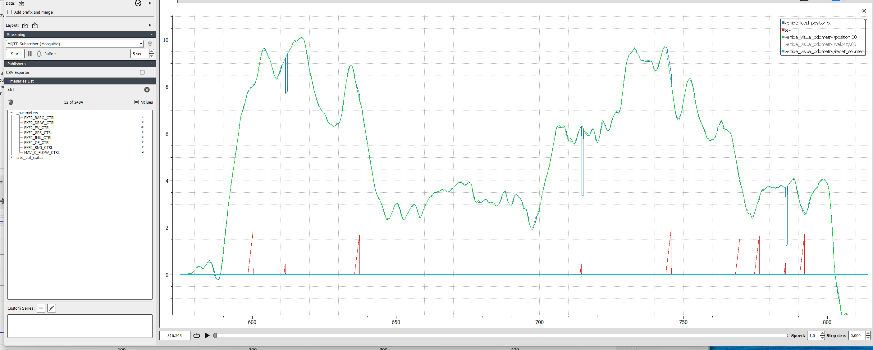 Autonomous drone flight w/ onboard companion jetson: lidar → external visual odometry. From image, can see (in legend order), PX4 local position estimate (notice jumps), tev = custom function: time difference in successive samples from visual odometry being sent to flight controller… The big tev jumps occur due to microagent (uxrce-dds agent) restarting, interestingly this doesn’t cause the local position jumps. its only the medium spikes in tev that cause these position jumps. plzzzz help!