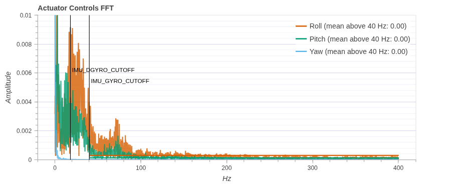 IMU_GYRO_CUTOFF and IMU_DGYRO_CUTOFF to filter out noise. I generally see noise at 50Hz. Here is an example