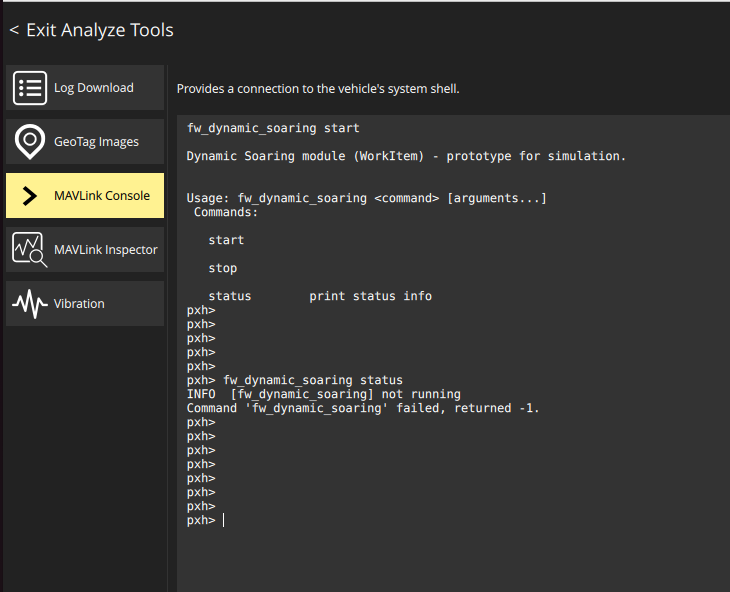However, in the console, when I write “help”, I don’t see “fw_dynamic_soaring”. And when I type in the MAVLink Console “help”, the command “fw_dynamic_soaring’“ does not appear.