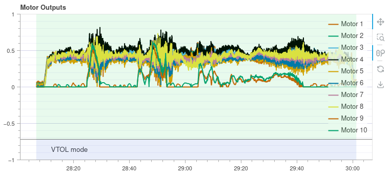 I’m flying a lift + cruise VTOL with a total mass of about 16 kg. It features 8 hover motors and 2 pusher motors for forward flight, all controlled via UAVCAN v0. The flight controller is running a custom version of the latest stable release, and everything has been tuning quite nicely for basic hover and transition maneuvers.