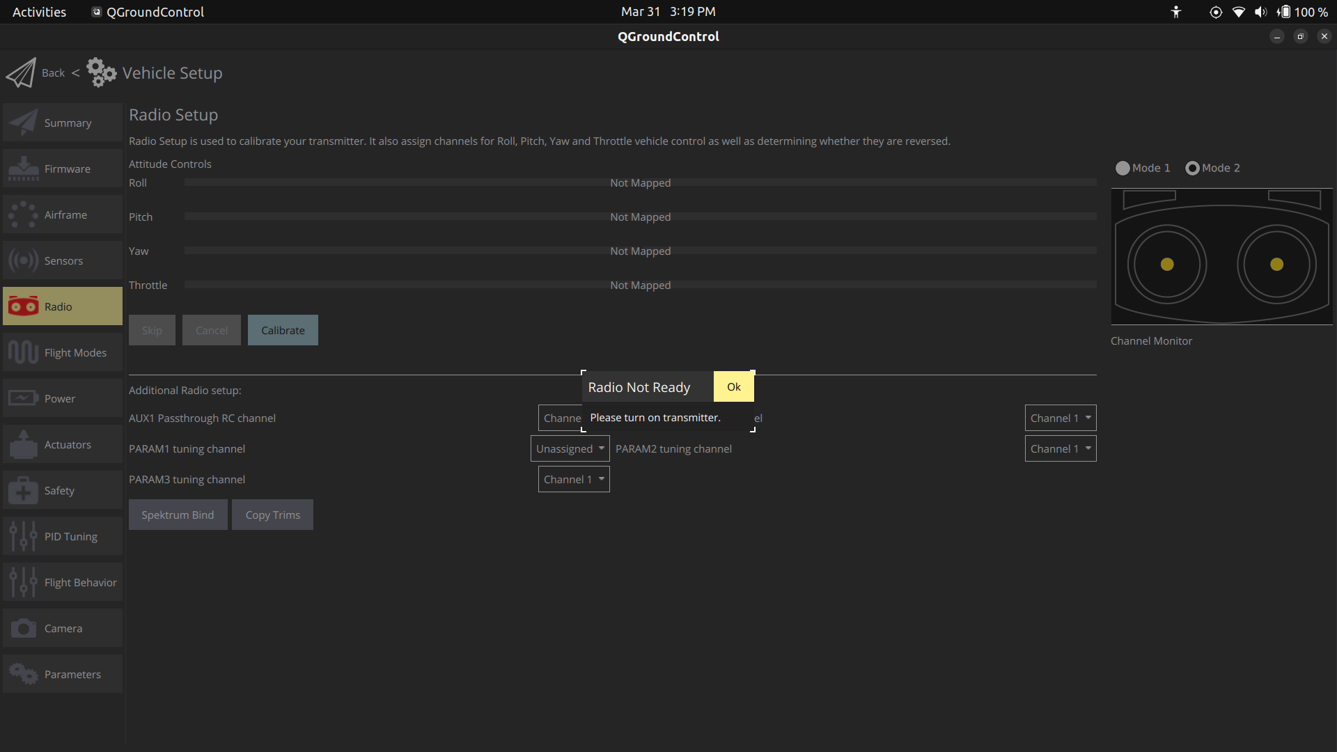 I’m having trouble getting my flight controller to detect any RC input. Specifically, my Pixhawk 6C flight controller is not recognizing signals from my FlySky FS-iA6B receiver, even though the transmitter is bound and the receiver appears to be working. In QGroundControl, no channels are detected and calibration fails with: