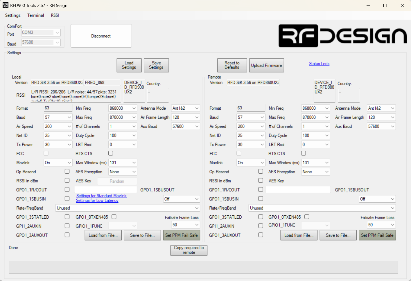 On RFD Tools I have the following default settings to the radios. I am also able to upload and change settings just fine, so it seems the radio link as such is working: