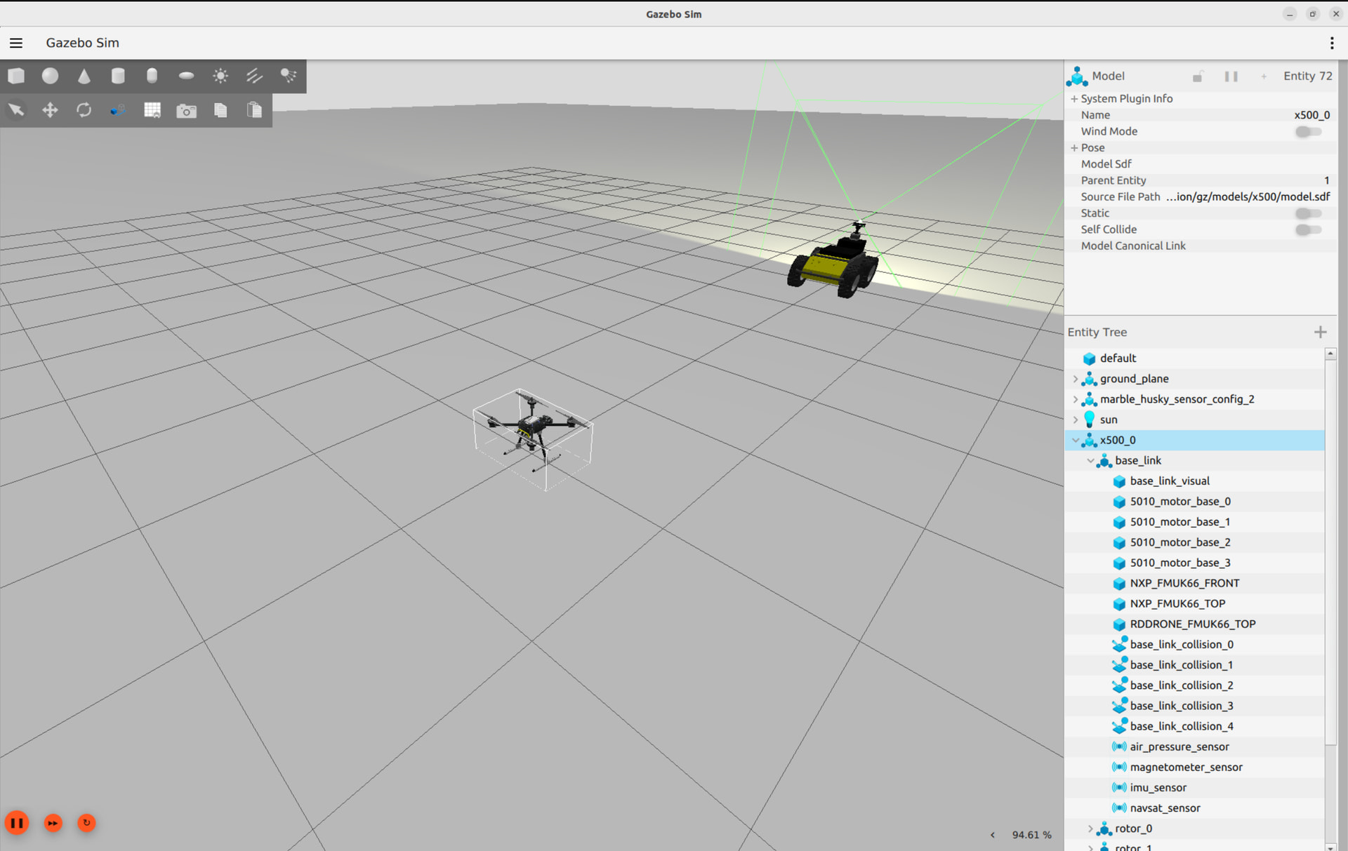 I’m running PX4 SITL with Gazebo Sim and ROS2/MAVROS2, and I’m stuck on preflight sensor failures whenever I integrate a Husky robot + custom world with the x500. When I run the stock x500 setup alone, everything works great (including Offboard via ROS2). As soon as I move to my landing_zone world with Husky, PX4 reports missing sensors and refuses to arm.