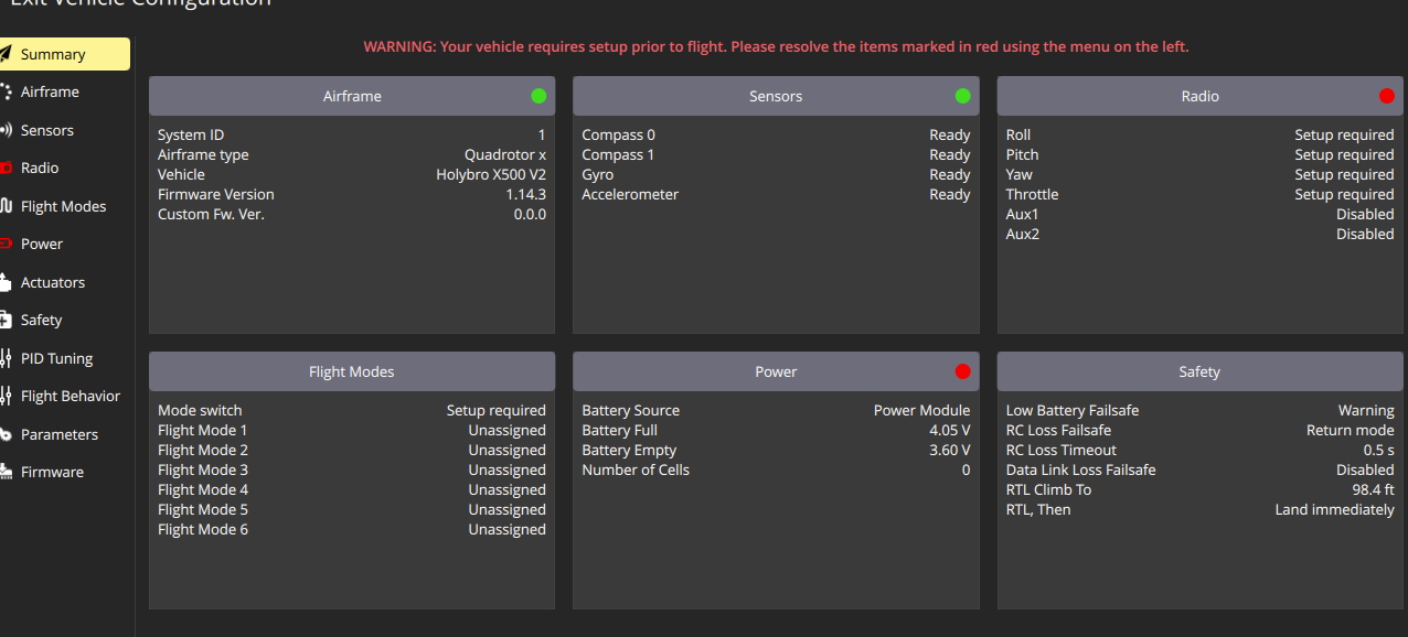 I connected the vehicle to my PC using USB. Now I am able to see the summary details. Now I am going go through the setup in the link to complete the setup for its maiden voyage.