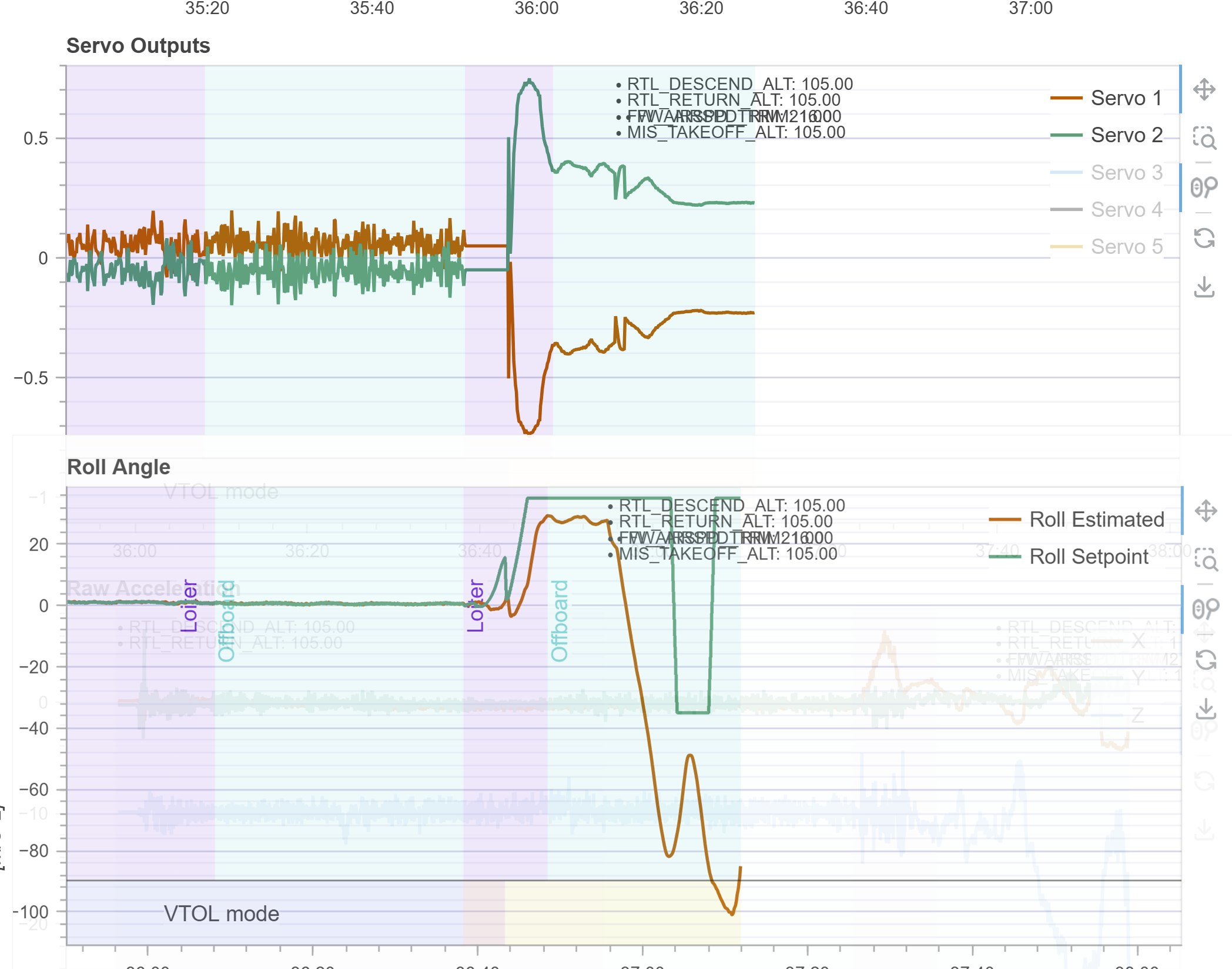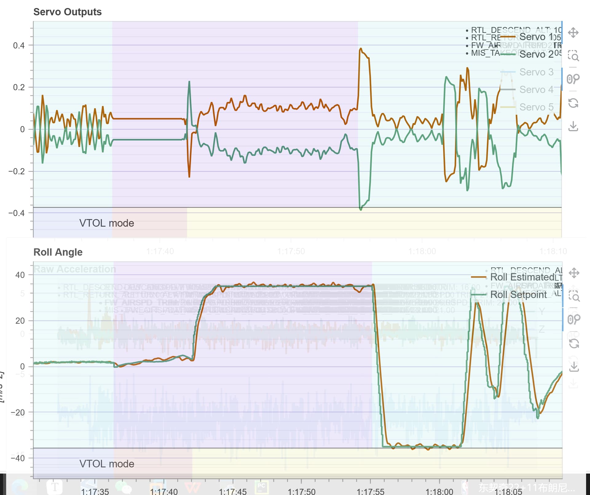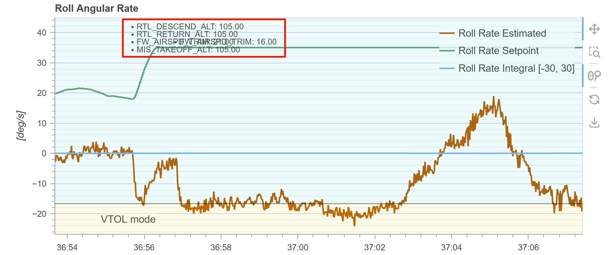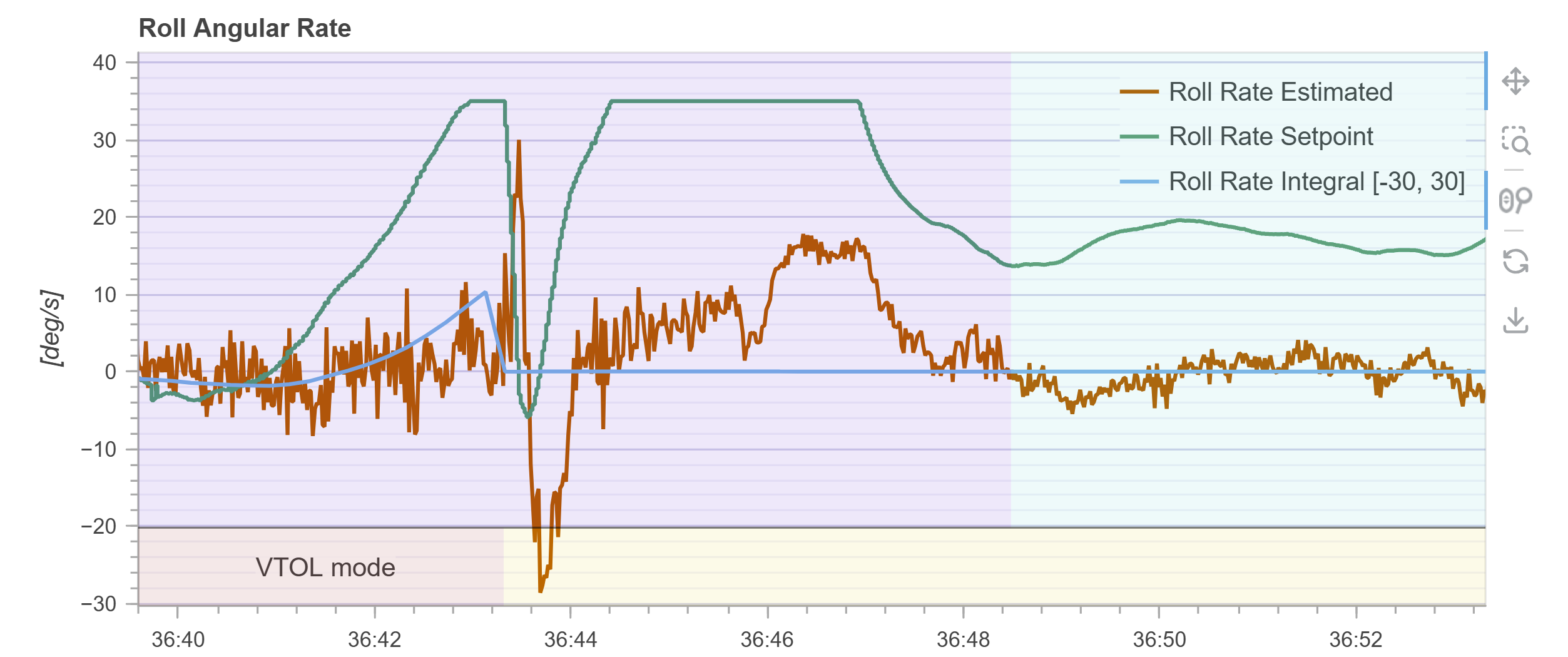 the fixed-wing roll_rate could not track the commanded values, leading to increasing control deviation and eventually causing the vehicle to lose control and crash. The failed log figure is shown as follows: