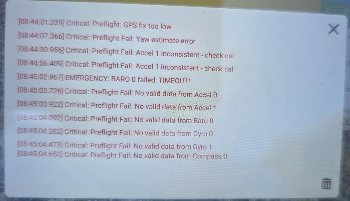 These errors appear immediately after powering on. After waiting a couple of minutes, the system eventually initializes correctly (status becomes green), and I’m able to fly without any issues.