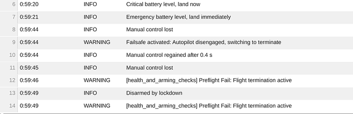 During one of our indoor tests in Stabilized Mode, approximately 40 seconds after the autopilot detected takeoff, the motors suddenly stopped. If the drone had not been tethered, it would have crashed. To determine the root cause of this incident, I analyzed the flight logs (link here), reviewed the PX4 source code, and used the failsafe simulator to test various failsafe flag configurations.